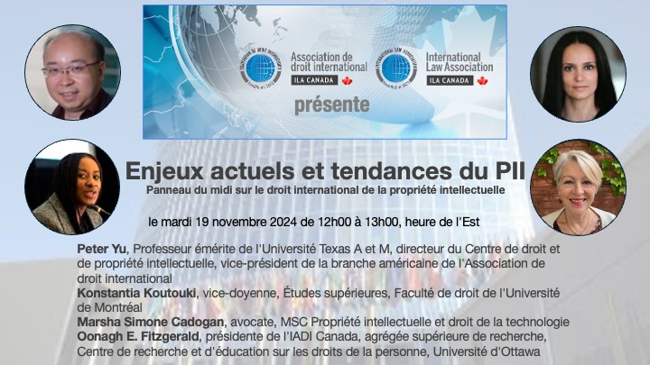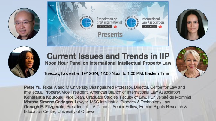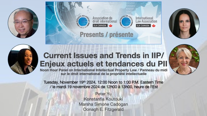 Please join Current Issues and Trends in IIP, ILA Canada's Noon Hour Panel on International Intellectual Property Law, taking place Tuesday, November 19th 2024 from 12:00 Noon to 1:00 P.M. Eastern Time.