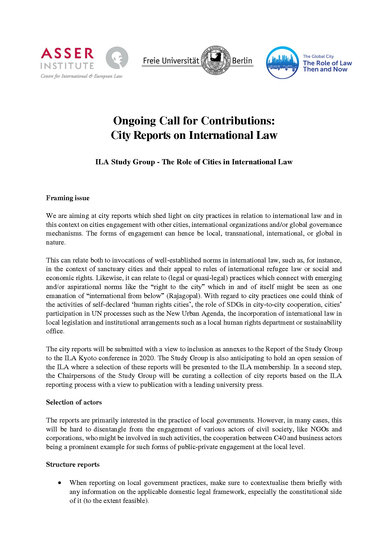 More information on the call can be found here: https://www.asser.nl/about-the-institute/asser-today/ongoing-call-for-contributions-city-reports-on-international-law/
